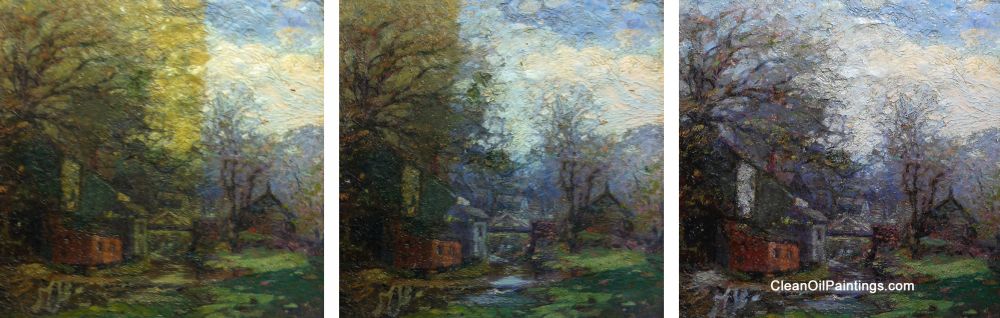 The middle photo shows the painting during the cleaning process. Note the color of the sky and cobblestone street on the left side of the painting.